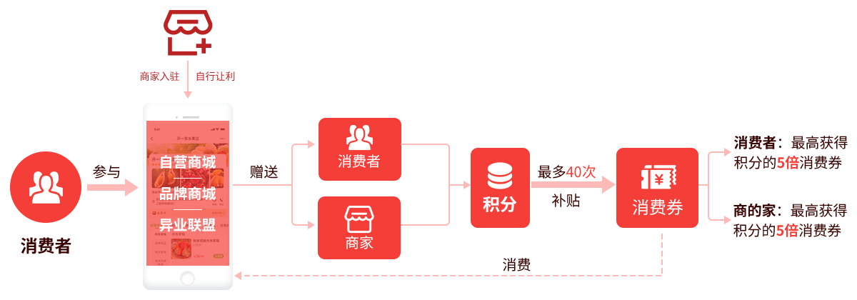 举例:商家A自行设置让利比例为20%,商家及其店内的消费者均可获得让利额等量的积分,同时还可获得积分数量5倍的消费券
